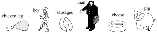 Look at the 6 pictures shown.Which one would weigh the following?500 g < …………… < 2000 gChoose your answer:ApigBchicken legCmanDboyEcheese